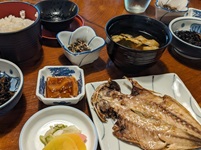 昼メシは「美味しいランチ」という名前の“干物”定食。5種類の地魚の刺身も堪能できる美味しい昼食をいただきました。 |