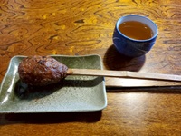 焼いた味噌味のおはぎというかきりたんぽというか、そんなお菓子ですね |